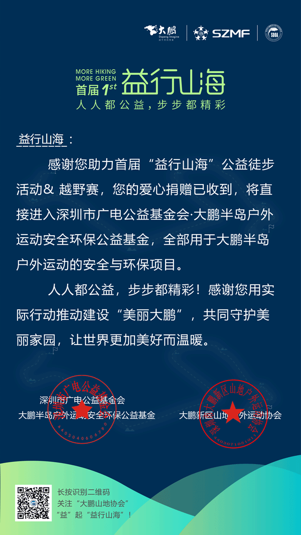 这样做的初心是通过发动筹款,一传十十传百的方式去传播去为公益打call,让参与的人发动并影响身边更多的人,让更多人开始关注并意识到大鹏半岛户外运动安全与环保的严峻形势,推动户外运动安全环保的意识与理念的改变。